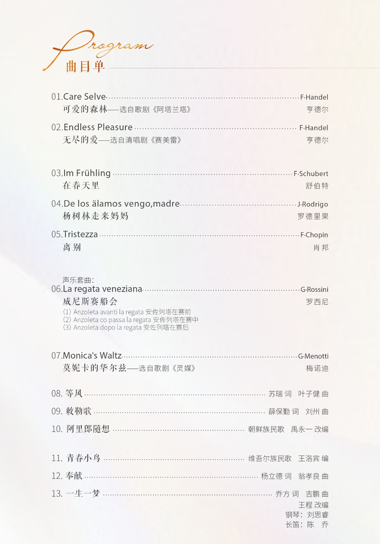 作為優(yōu)秀的聲樂鋼琴伴奏家,具有嫻熟的演奏技巧和豐富的作品積累,多年來曾受邀與吳碧霞、郭森、石倚潔、DENYCE GRAVES等眾多國內(nèi)外著名歌唱家合作演出。