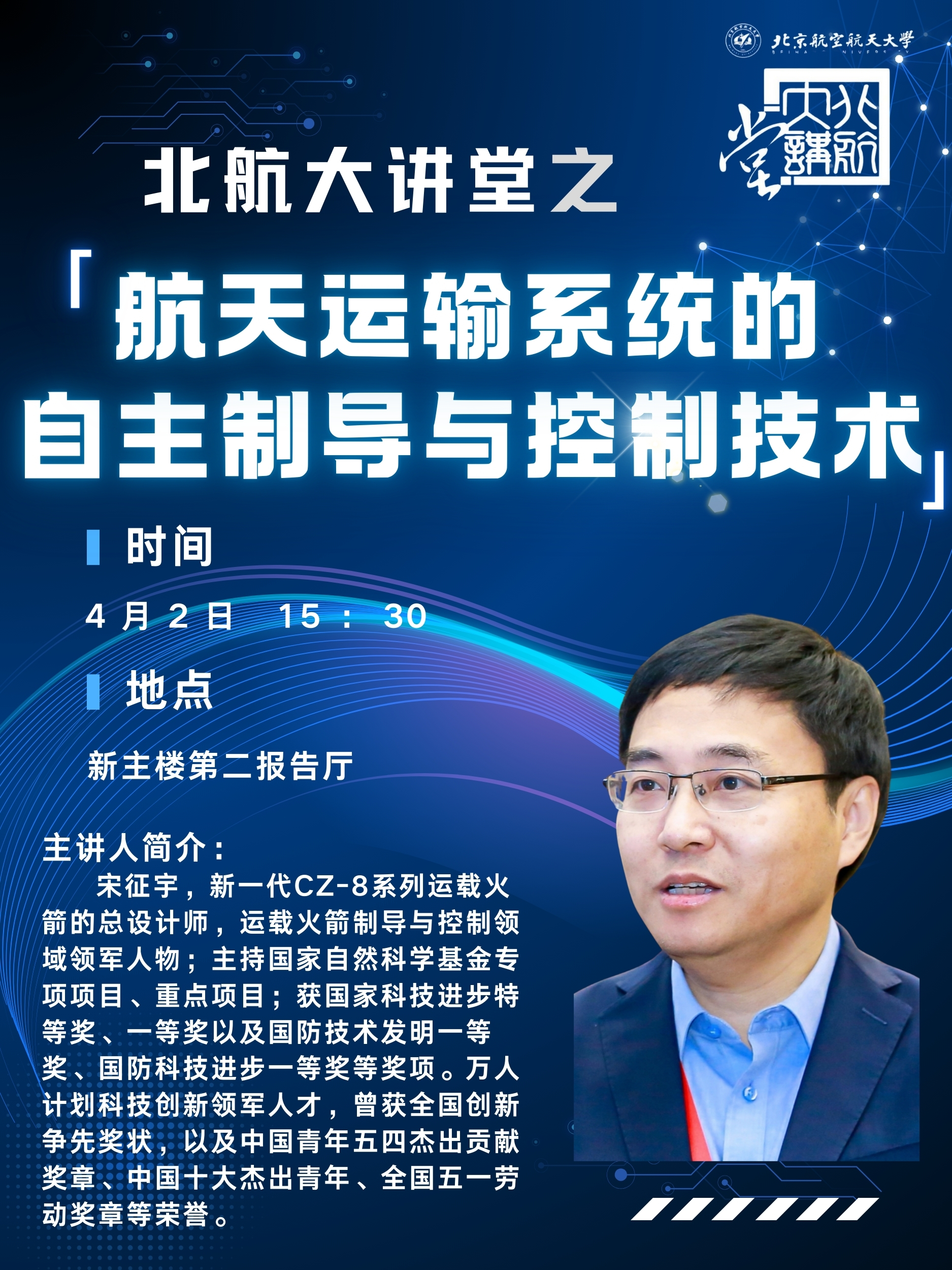 宋征宇,我國新一代CZ-8系列運載火箭的總設計師,運載火箭制導與控制領域的領軍人物,為載人航天、探月工程四期、衛星互聯網等國家航天重大工程做出了重要貢獻。主持國家自然科學基金專項項目、重點項目;獲國家科技進步特等獎、一等獎以及國防技術發明一等獎、國防科技進步一等獎等獎項。國家級科技創新領軍人才,曾獲全國創新爭先獎、中國青年五四杰出貢獻獎章、中國十大杰出青年、全國五一勞動獎章等榮譽。