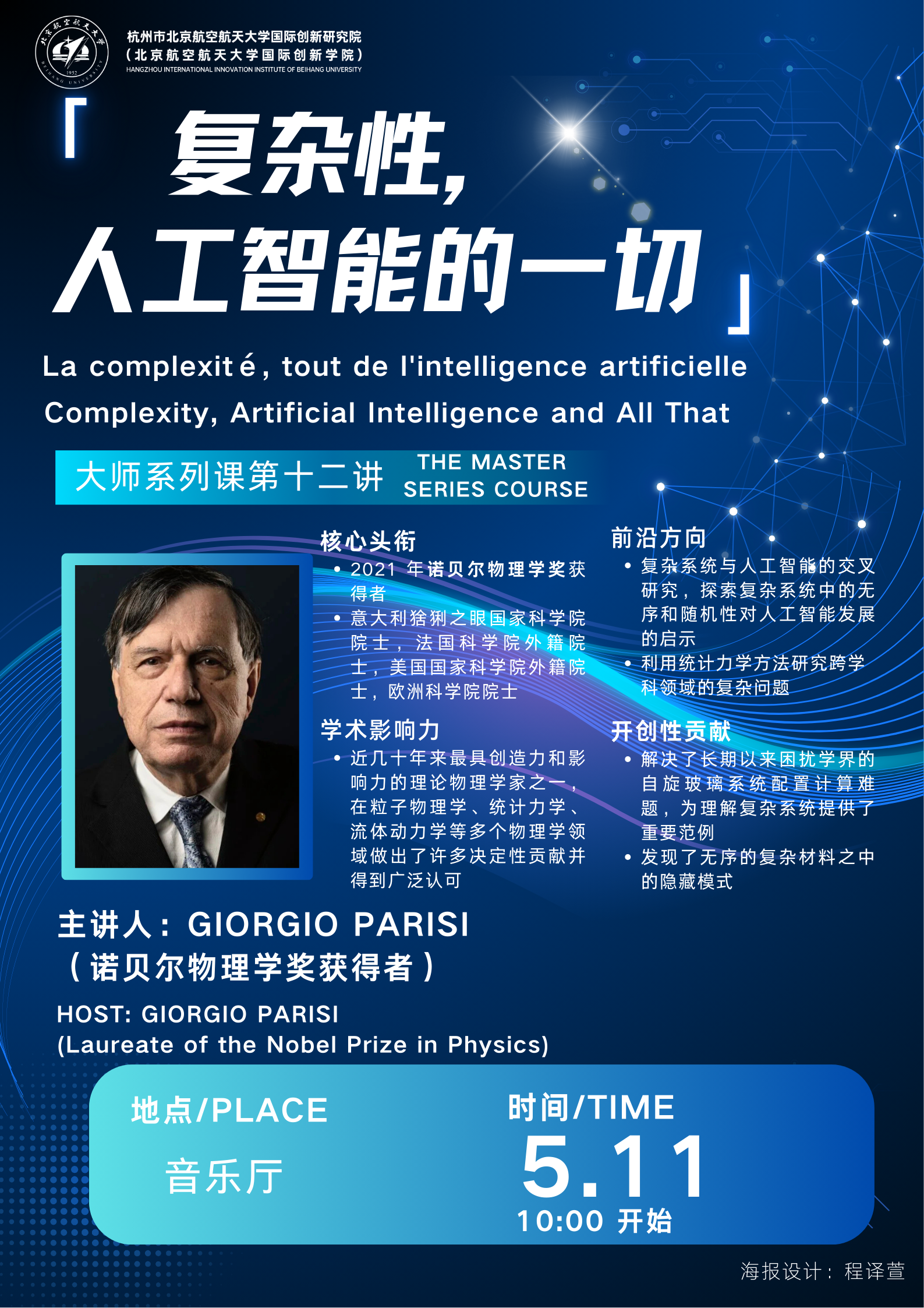 諾貝爾物理學(xué)獎(jiǎng)獎(jiǎng)勵(lì)人類物理學(xué)領(lǐng)域做出突出貢獻(xiàn)的科學(xué)家。Giorgio Parisi(喬治·帕里西)教授發(fā)現(xiàn)了從原子到行星尺度的物理系統(tǒng)中,無序和波動(dòng)的相互作用,獲得2021年諾貝爾物理學(xué)獎(jiǎng)。5月11日, 教授將做客北航,來到北航杭州國際校園,為北航師生帶來一堂大師課——“復(fù)雜性,人工智能的一切”,京杭兩地三校園將同步直播,歡迎北航師生前往收看。此外,與他一同做客北航的,還有另外兩位著名科學(xué)家,歐洲科學(xué)院院士張駿,歐洲科學(xué)院院士Luciano Pietronero,他們也將帶來精彩的學(xué)術(shù)講座。