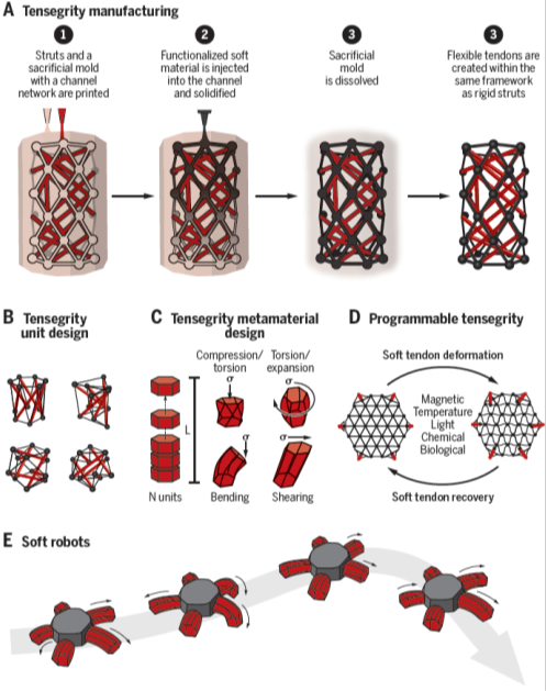 自從20世紀60年代巴克敏斯特·富勒(Buckminster Fuller)發明了“張拉整體結構”以來,人類已發現張力整體結構廣泛存在于細胞骨架、肌肉-骨骼系統等生物體中,并逐步將其原理應用于建筑、雕塑、空間探測等工程結構與機構中。由于張拉整體結構具有剛柔并濟、高機動性、高魯棒性等優勢,在機器人領域極具應用前景。軟體機器人,作為一種模仿生物并能與人安全交互的新型機器人,是近年來機器人學、力學、材料學等多學科交叉領域的研究熱點之一。然而要想實現能媲美生物體運動靈活準確、承受外載高效、適應環境迅速等復雜特性和功能,軟體機器人在材料和結構設計方面還面臨很大挑戰。由剛、柔結構共同組成的張拉整體結構就是一個新的突破點。然而,如何實現張拉整體結構的快速制造,如何利用張拉整體結構增強軟體機器人機械性能等問題尚待解決。
