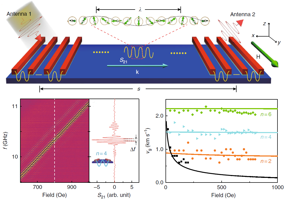 2018年2月21日,北京航空航天大學(xué)電子信息工程學(xué)院于海明教授組于《自然通訊(Nature Communications)》在線發(fā)表了題為“短波長自旋波的遠(yuǎn)距離傳播(Long-distance propagation of short-wavelength spin waves)”的研究成果,利用鐵磁金屬納米線陣列的動(dòng)態(tài)偶極相互作用在釔鐵石榴石薄膜材料中激發(fā)超短波長自旋波,其波長低至50 nm,傳播距離可達(dá)60000 nm,工作得到了北航大數(shù)據(jù)與腦機(jī)智能高精尖中心、國家自然科學(xué)基金及“青年千人”項(xiàng)目的大力支持, 并得到北航電子信息工程學(xué)院趙巍勝教授、張有光教授等專家的指導(dǎo)和幫助,在該研究領(lǐng)域居國際先進(jìn)水平,是北京航空航天大學(xué)自旋電子交叉學(xué)科研究中心2018年在《自然通訊(Nature Communications)》上發(fā)表的第2篇文章。
