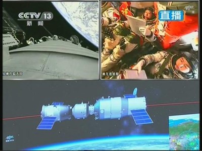 神舟九號飛船航天員劉旺操作飛船姿態控制手柄