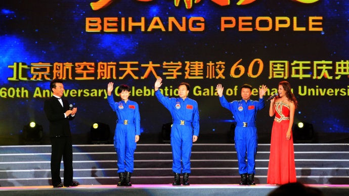 2012年10月,北航建校60周年慶典上,神舟九號的三位航天員景海鵬、劉旺、劉洋來到現場,他們分別表達了對北航60周年校慶的祝福,并向北航、向所有為中國航空航天事業做出貢獻的人們致敬