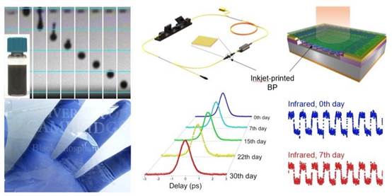 在黑磷噴墨打印技術的研究中,張夢老師及其課題組通過精確控制墨水化學成分并平衡其相互競爭的流體效應得到穩定的黑磷墨水,該墨水能高質量、高均勻性、高速地大規模打印新型功能性光電器件。采用該方法打印的黑磷應用到激光器中用作超快光開關,將激光器的連續光輸出轉變為超短脈沖序列,有利于該項技術在工業和醫療方面的推廣應用。張夢老師表示:“相比于其它研究,我們使用打印黑磷設計的非線性光學器件顯著提升了運轉性能和穩定性。”